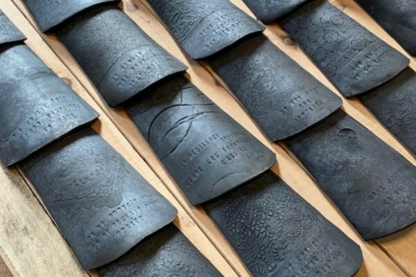 J’ai voulu donc créer une œuvre qui pouvait parler de la classe ouvrière des deux lieux, créer un pont entre ces deux territoires voisins, tout en évoquant leur histoire et leur mémoire par le récit. Ici, chaque élément était réalisé et moulé à partir des cuisses des habitants participant à la conception de l’œuvre : ouvriers, immigrés et anciens travailleurs des usines dans la région. Chaque tuile est noire et a sur sa surface des mots, des récits, des phrases provenant de la rencontre avec les participants. Nous avons réalisé d’ateliers d’écriture autour de l’exil et des mémoires individuelle et collective.